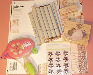 I used Basic Grey, House Mouse Design Of the Month July, Copics, Glue Glider Pro Kaiser Craft Rhinestones , Coredinations Core Armour, Tim Holtz Sanding Grip & Martha Stewart Daisy Corner Punch to create my first easel card.